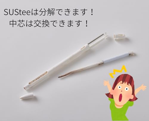 SUSTEEはプラスチックの棒状の筒内に水分を吸い上げるティッシュのような薄い布が入っていて、筒上部にあるpH検出紙が水分を検出して青く変わるという仕組みです。(詳しくは特許第5692826号を参照)